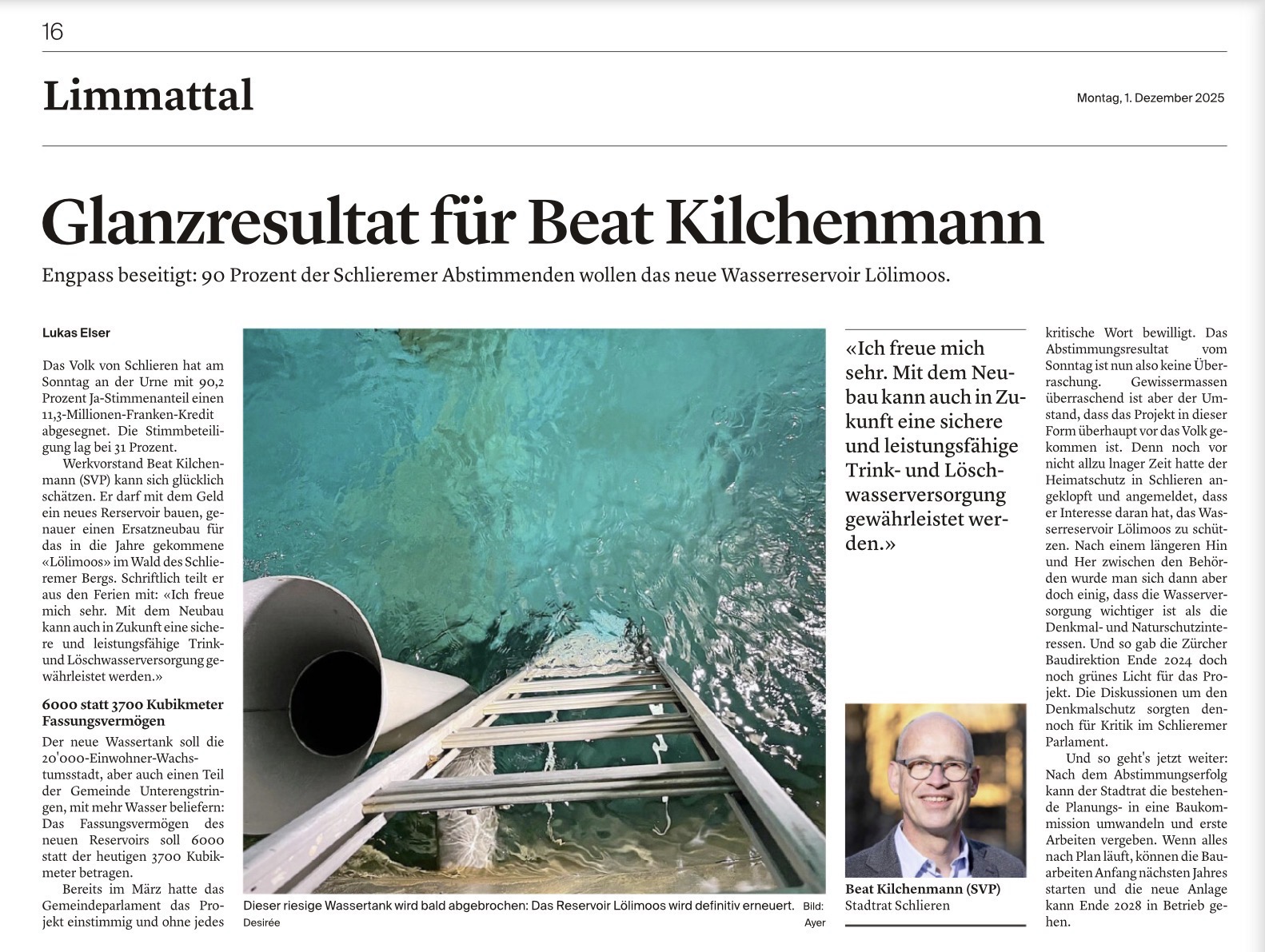 01.12.2025 Limmattaler Zeitung: Wasserreservoir Lölimoos Glanzresultat bei Volksabstimmung